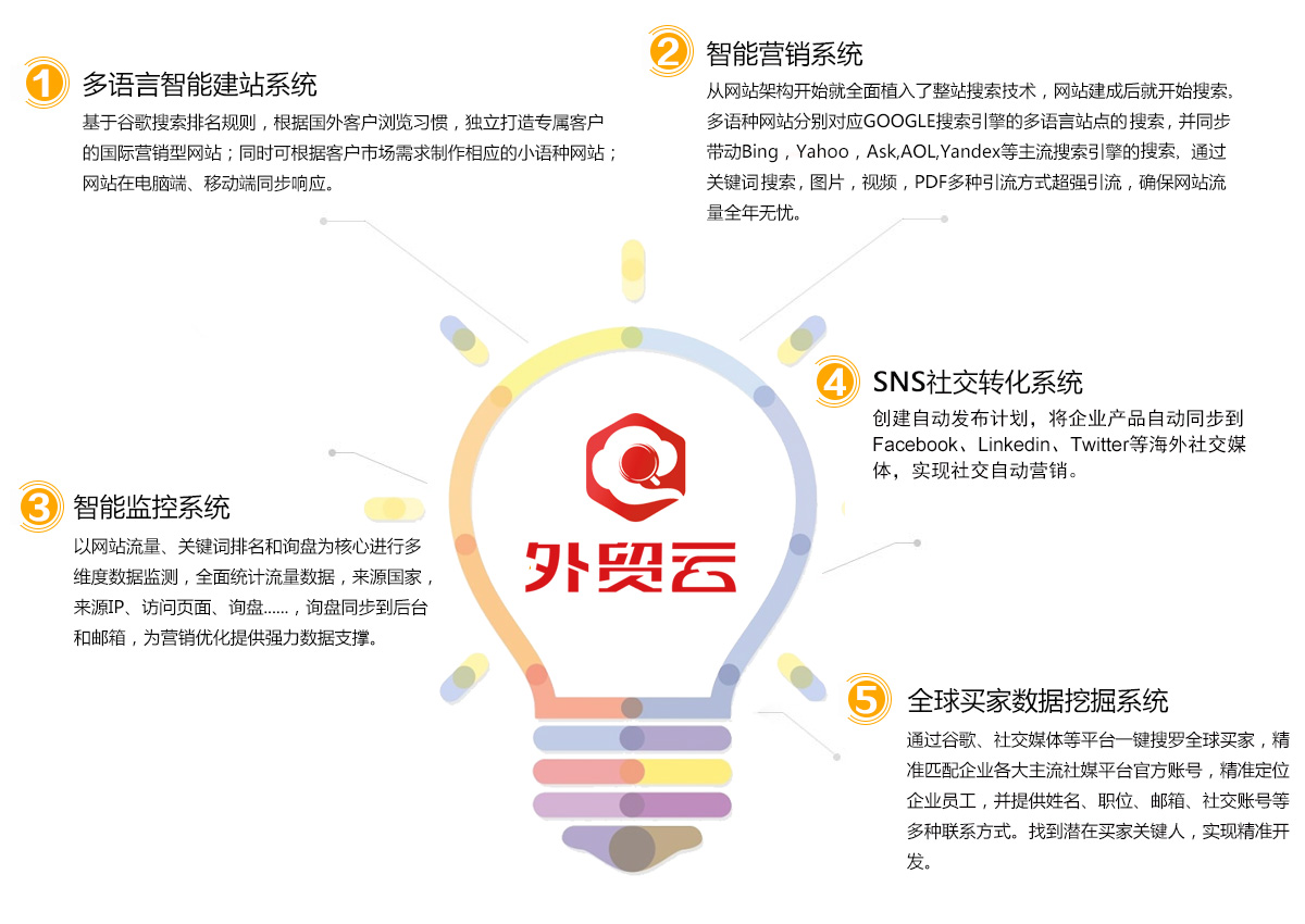 外贸云产品是基于易商互联超过10年的外贸营销和SEO技术优势,实现关键词裂 变,符合各大搜索引擎收录并排名,让您在众多竞争对手中脱颖而出。